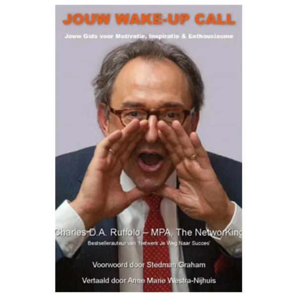 ‘Jouw Wake-Up Call’ is jouw persoonlijke gids voor inspiratie, motivatie en enthousiasme. Het geeft een kijkje in iemands geest die niet alleen geschoold is, maar ook een uitgeslapen bij de pinken zijnde zakenman is, die heeft moeten omgaan met verschillende situaties met familie, vrienden en zaken. ‘Jouw Wake-Up Call’ is een combinatie van eigenschappen waarvan Ruffolo van mening is dat iemand die moet hebben, om in het dagelijks leven geïnspireerd, gemotiveerd en enthousiast te blijven “Dit boek onthult het ware verhaal van een man die het vertelt zoals het werkelijk is, liefde in zijn hart heeft en een oprechte betrokkenheid toont voor anderen in zijn netwerk.” Stedman Graham, New York Bestsellerauteur & CEO S. Graham & Associates “Charles Ruffolo is een man met een unieke kijk op de zakelijke wereld die hij baseert op een leven van zowel succes als tegenslag. Hij illustreert de moeilijke beslissingen die je moet nemen om, ‘het gevecht dat leven heet’ te overwinnen.” Generaal bd Wesley K. Clark – Voormalig NAVO-Opperbevelhebber van de Geallieerde Strijdkrachten in Europa & CEO Wesley K. Clark & Associates Charles D.A. Ruffolo (1957) vestigde zich in Nederland, na een carrière in het Amerikaanse leger, en verrijkte onze zakenwereld met zijn talenten als professioneel netwerker. Ruffolo is internationaal spreker, trainer, moderator en Founder van The NetworKing Academy en Stichting Giving Back. Hij spreekt meer dan 150 keer per jaar in meer dan 10 verschillende landen. Ruffolo is ook de man die voormalig President van de Verenigde Staten, Clinton, Sir Richard Branson, Stedman Graham, Al Gore, generaal Wesley Clark en verschillende andere high profile personen naar Nederland heeft gebracht. Hij schreef een bestseller over netwerken, ‘Netwerk Je Weg Naar Succes’, dat ook is verschenen in het Engels en Chinees en hij is de bedenker van het netwerk kaartspel de ‘Ruffle Shuffle’. Charles is al meer dan 34 jaar getrouwd met Herma. “Vergeet niet dat elke dag nieuwe lasten, nieuwe twijfels en zorgelijke nachten met zich mee zal brengen, maar morgen ZAL een nieuw sprankje hoop geven en de wil om opnieuw te beginnen.” Charles D.A. Ruffolo – MPA, The NetworKing.